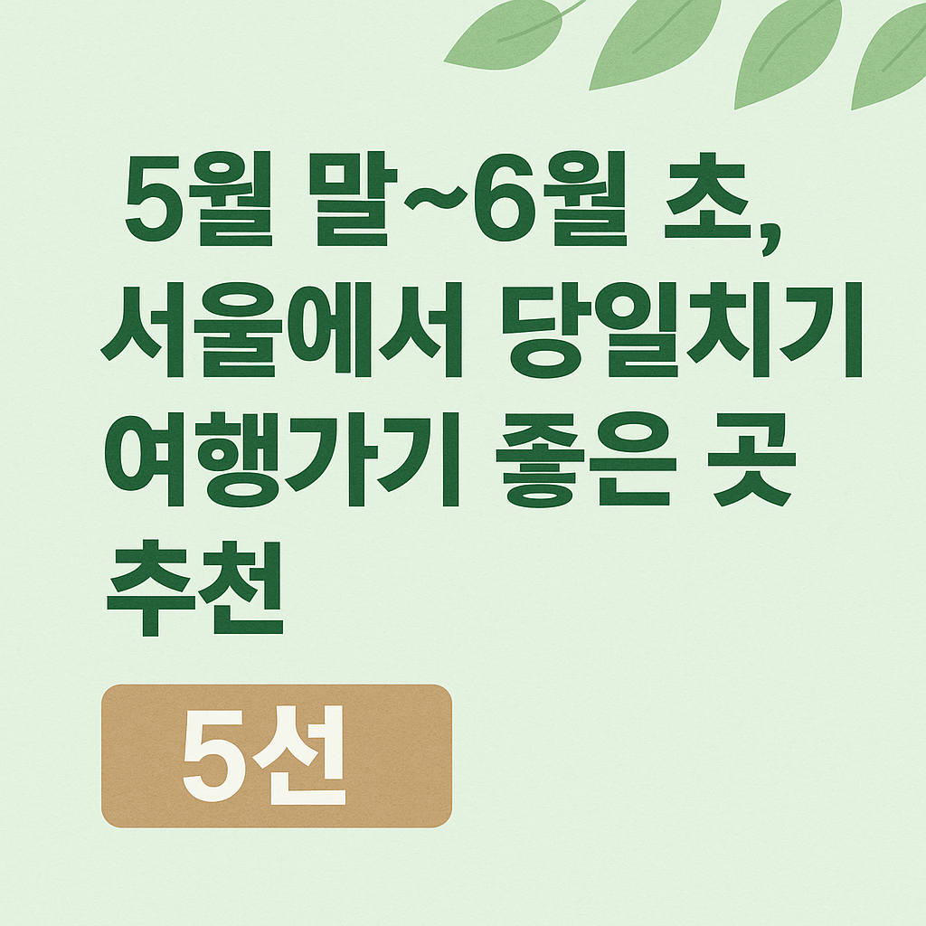 🌿 5월 말~6월 초, 서울에서 당일치기 여행가기 좋은 곳 추천 5선!초여름의 시작, 5월 말에서 6월 초! 서울 근교로 하루만에 다녀올 수 있는 여행지를 소개합니다. 날씨도 따뜻하고 자연도 푸르러 산책하기 딱 좋은 시기예요. 복잡한 계획 없이도 힐링하고 돌아올 수 있는 여행지를 모았습니다.1. 남양주 다산생태공원 & 다산 정약용 유적지📍 위치: 경기 남양주시 조안면🚗 서울에서 차량으로 약 40분✅ 특징: 북한강 뷰 + 산책로 + 역사 탐방🍽️ 추천 먹거리: 다산한정식, 북한강 근처 카페남양주는 자연과 문화가 조화를 이루는 곳입니다. 북한강을 따라 조성된 산책길과 함께 다산 정약용 선생의 유적지에서 짧은 역사여행도 함께 할 수 있어요.2. 양평 두물머리 & 세미원📍 위치: 경기도 양평군 양서면?..