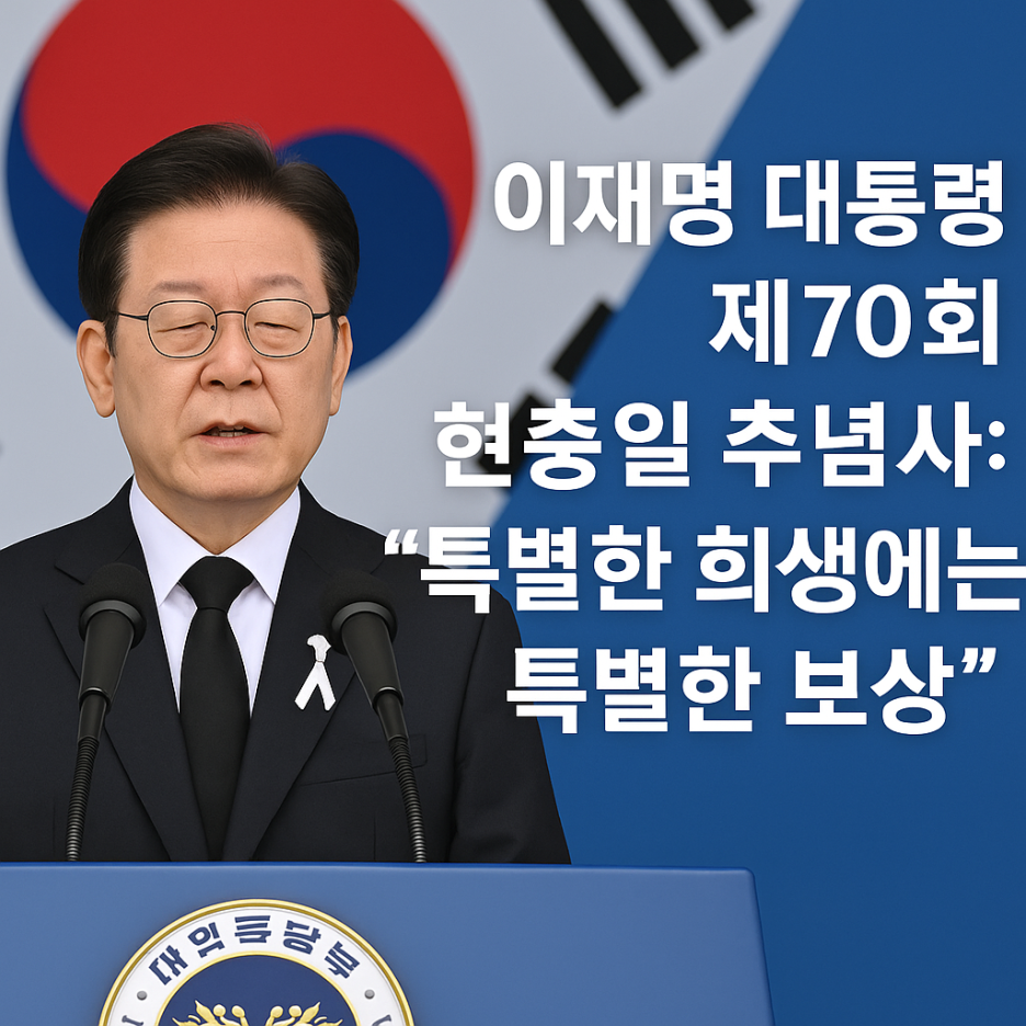 오늘, 제70회 현충일을 맞아 이재명 대통령이 국립서울현충원에서 추념사를 통해 순국선열과 호국영령의 희생을 기리고, 국가유공자에 대한 예우와 지원 강화를 약속했습니다.